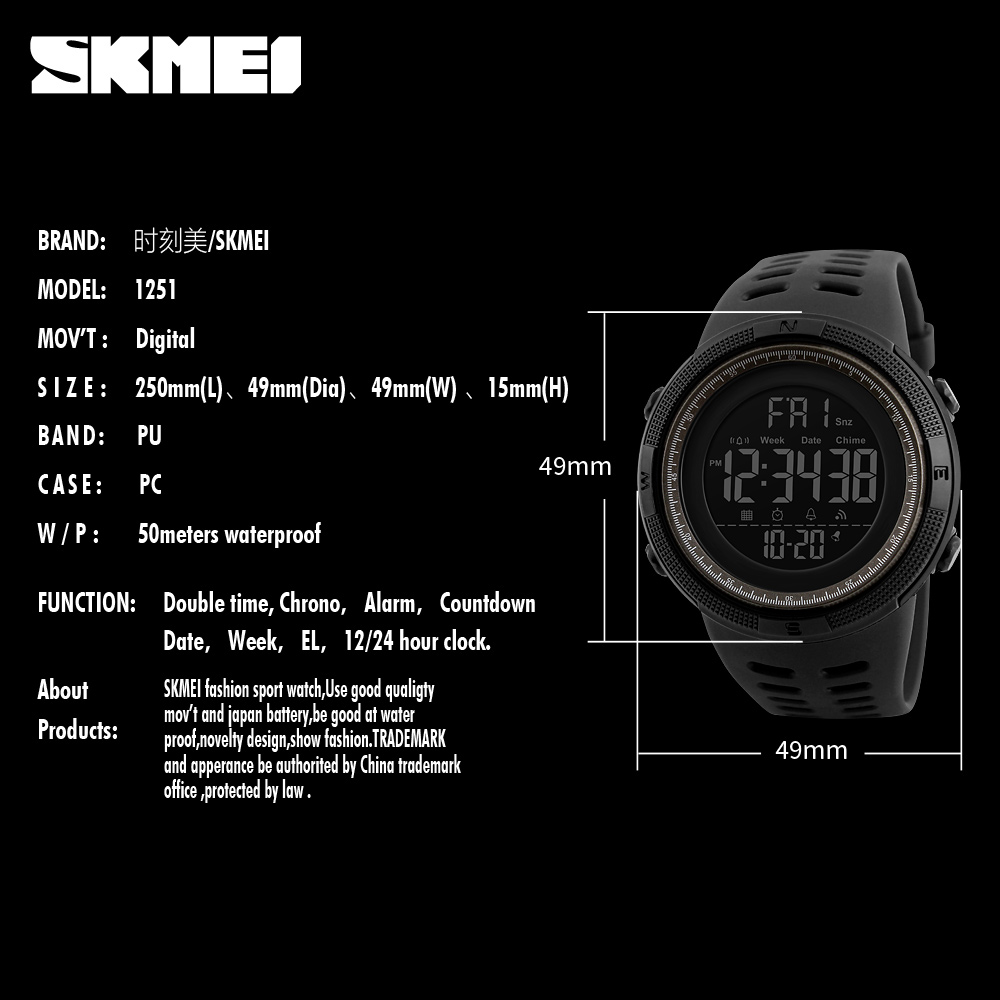 The SKMEI 1251 is engineered for performance in both urban life and rugged environments. With 50M water resistance, a clear digital interface, and multiple timing modes, it is ideal for those needing a durable waterproof digital watch without compromising style.