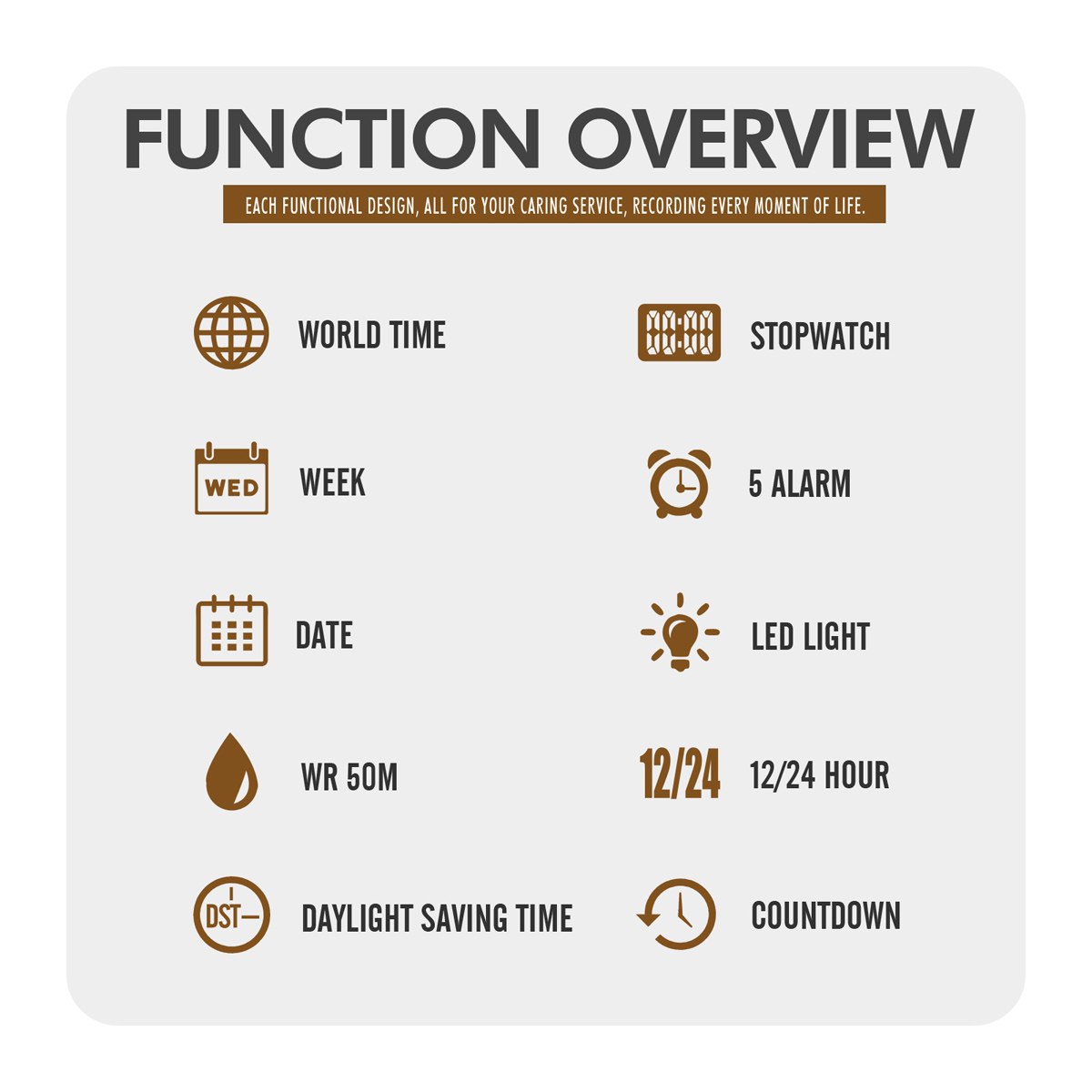 From second-accurate stopwatch and alarm to an automatic calendar and dual time zones, the digital analog waterproof watch keeps you on time no matter your schedule or location.