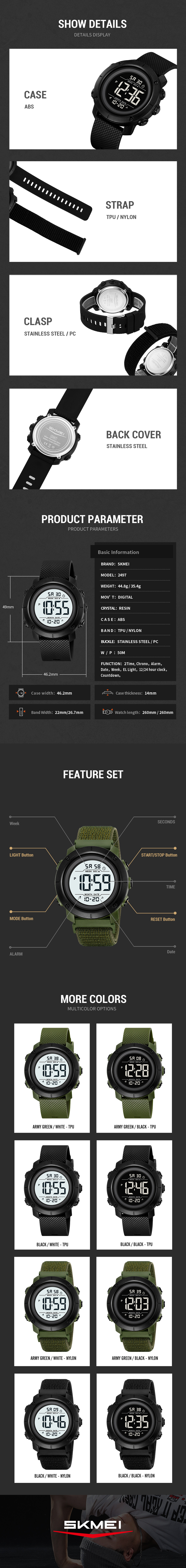 The SKMEI 2497 digital sports watch features a rugged ABS case measuring 46.2mm x 49mm, ideal for those seeking a best waterproof digital sports watch for running. Its lightweight 33g design ensures all-day comfort without bulk, perfect for fitness enthusiasts tracking daily routines.