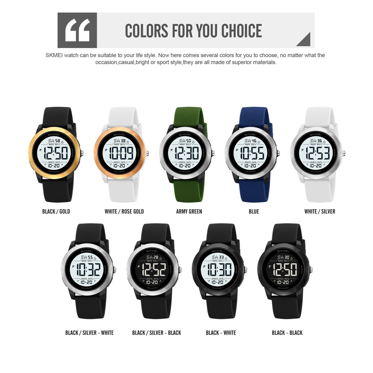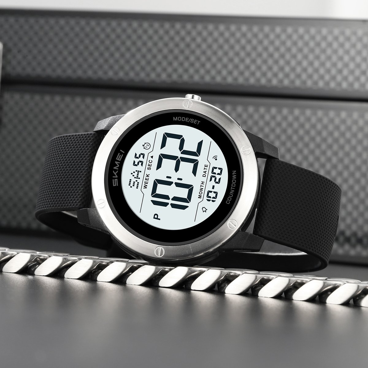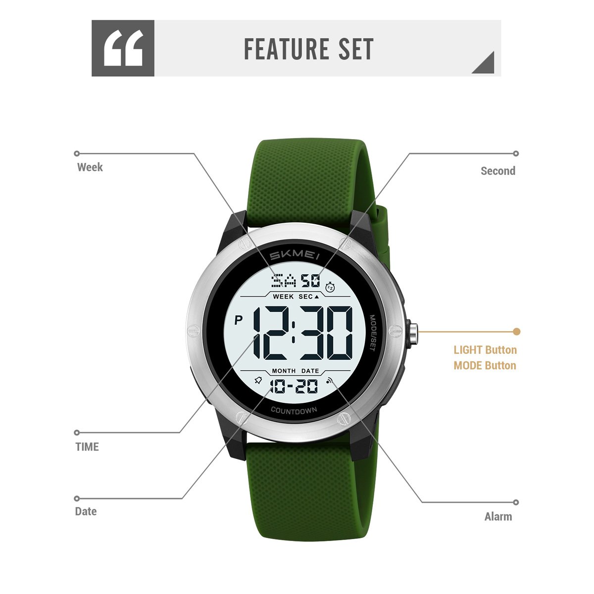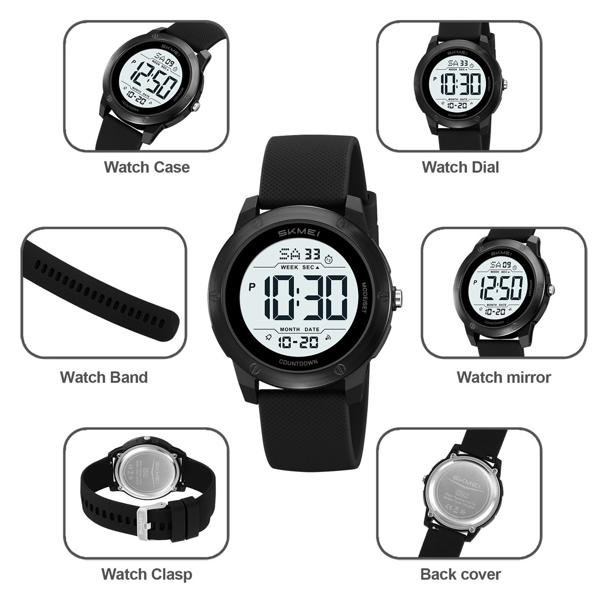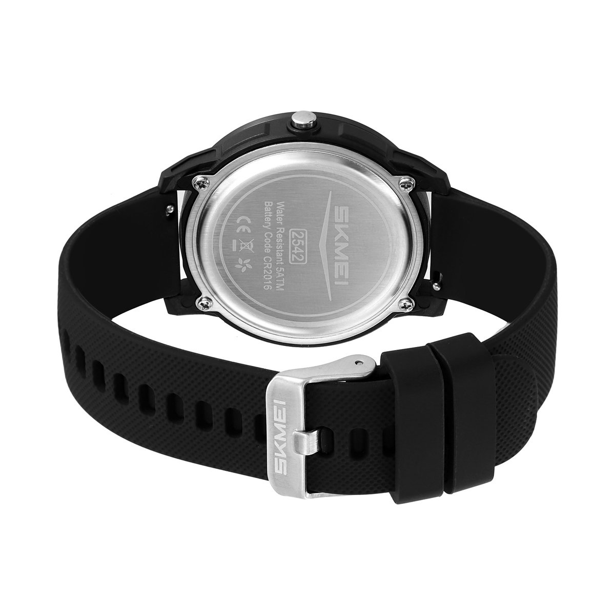 SKMEI 2542 includes alarm, stopwatch (chronograph) and countdown timer, covering critical time-management needs for sports, work or survival scenarios.