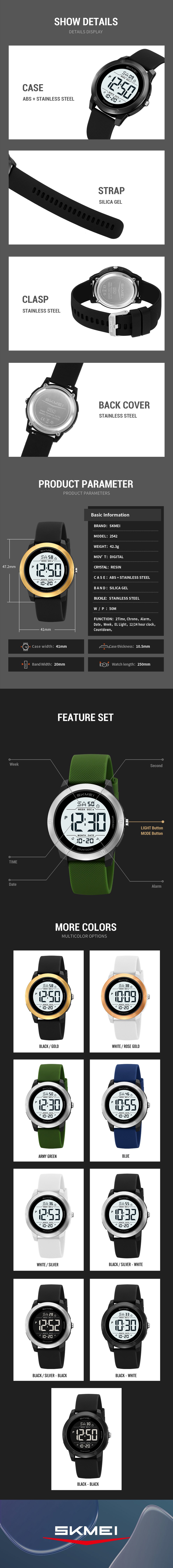 SKMEI 2542 is a rugged digital timepiece built for everyday and outdoor use. It features dual time, stopwatch, alarm, date and backlight for versatile timekeeping.