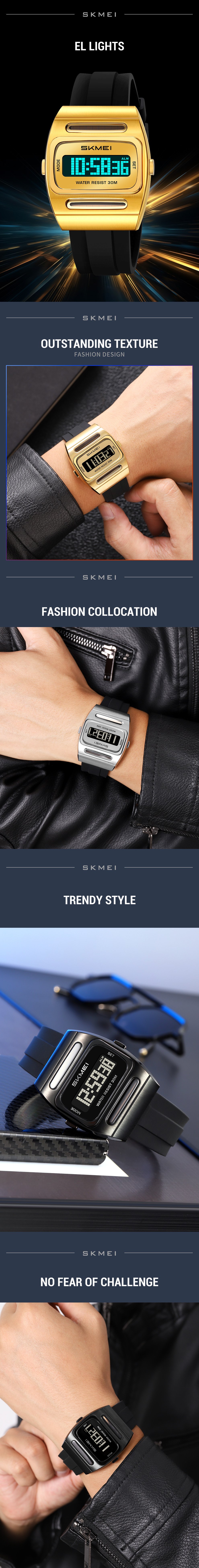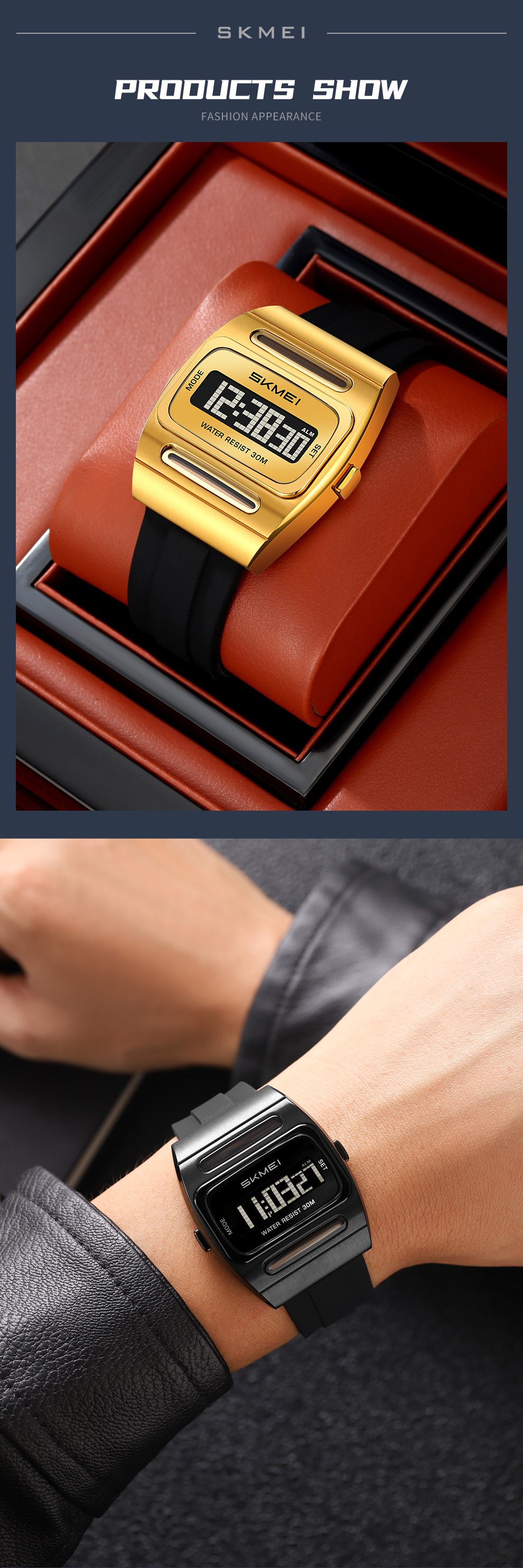 The SKMEI 2563 retro futuristic Y2K men’s digital watch features a creative rectangle case that stands out in street style and casual outfits.