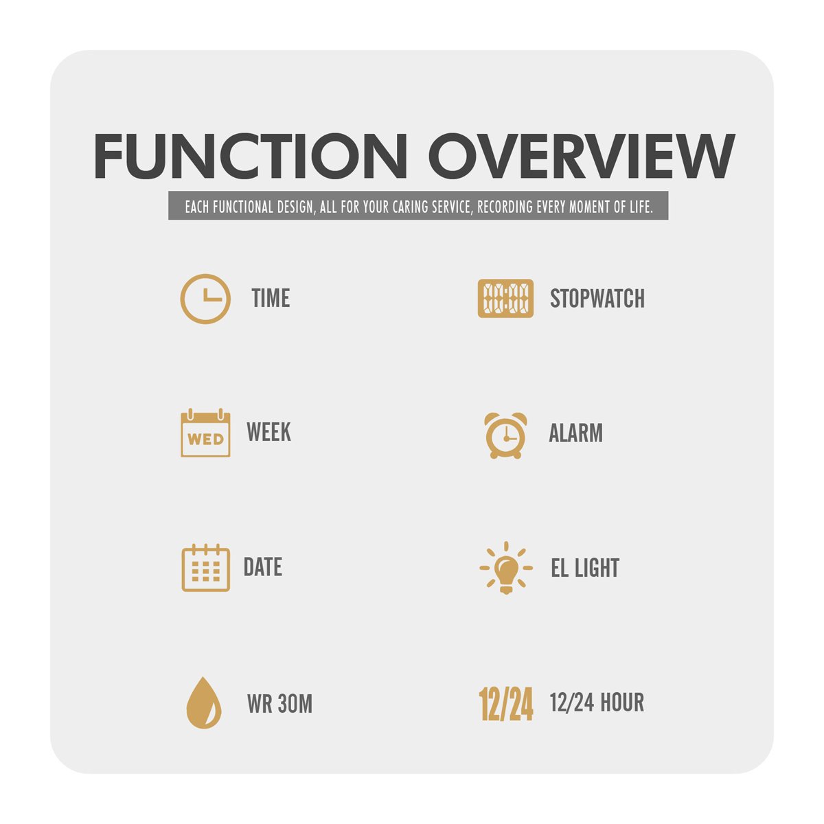 The watch integrates time, chronograph, countdown timer, alarm, date, week and 12 24 hour clock to support versatile timing needs.