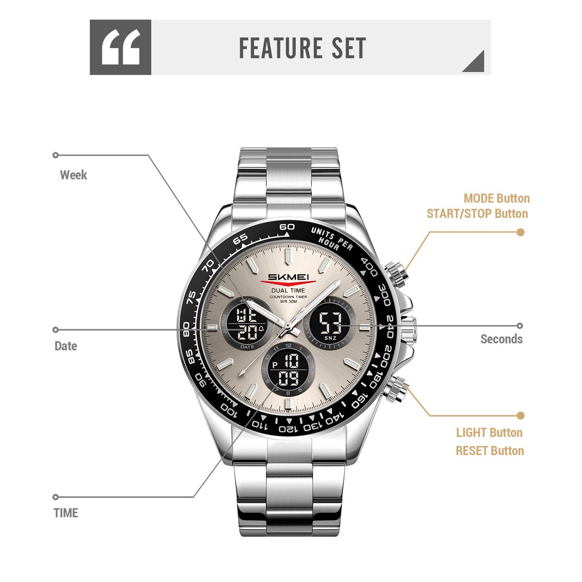 SKMEI 2587 features a robust zinc alloy case and a stainless band alarm watch design, offering durable construction and a comfortable fit for long wear.Display and Backlight