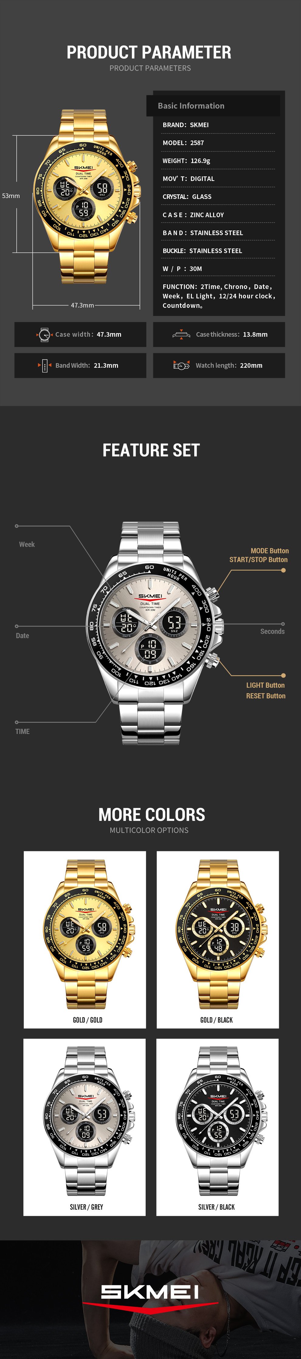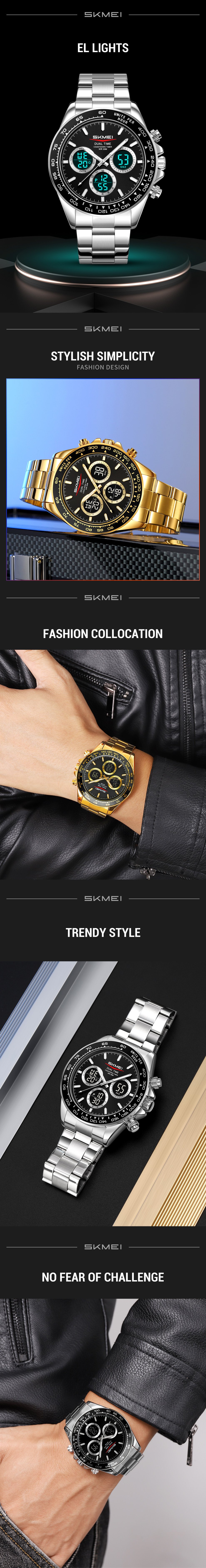 The SKMEI 2587 is a premium zinc alloy wristwatch built for reliable everyday use, combining practical digital functions with a classic metal design that suits both casual and business wear.Dual Time & Stopwatch Functions