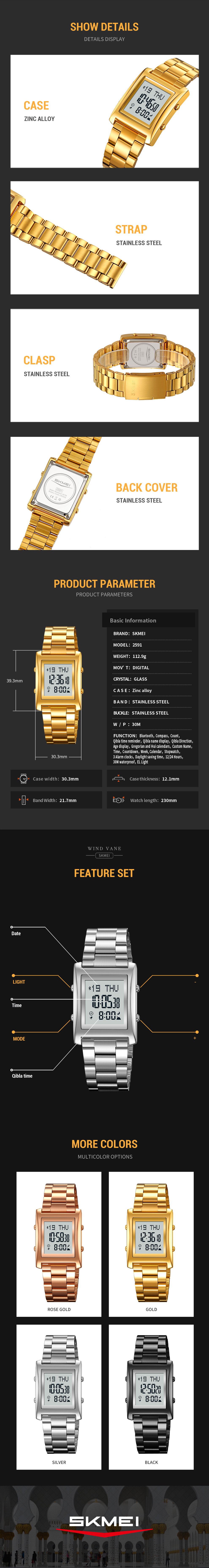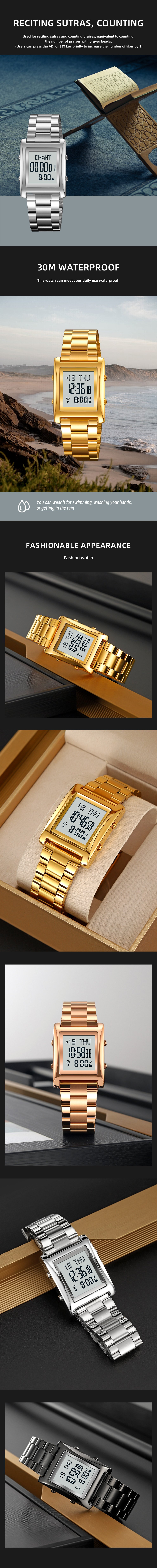 SKMEI 2591 brings together sporty rectangular style, practical chronograph functions, and prayer‑specific utilities. Whether you need a reliable LED backlight chronograph for workouts or a rectangular dial countdown watch for daily scheduling and prayers, this model delivers on multiple fronts.