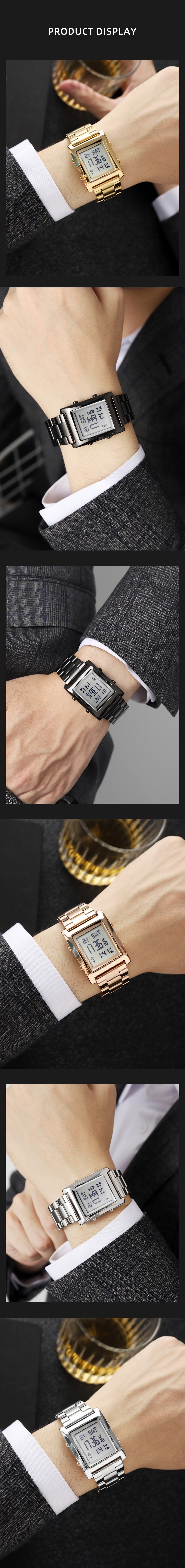With a rectangular case measuring 30.3 mm × 39.3 mm and a stainless steel band, the watch delivers a durable, modern aesthetic. The zinc alloy case ensures lightweight comfort on the wrist while maintaining a sturdy feel.Digital Display & Dial Style
