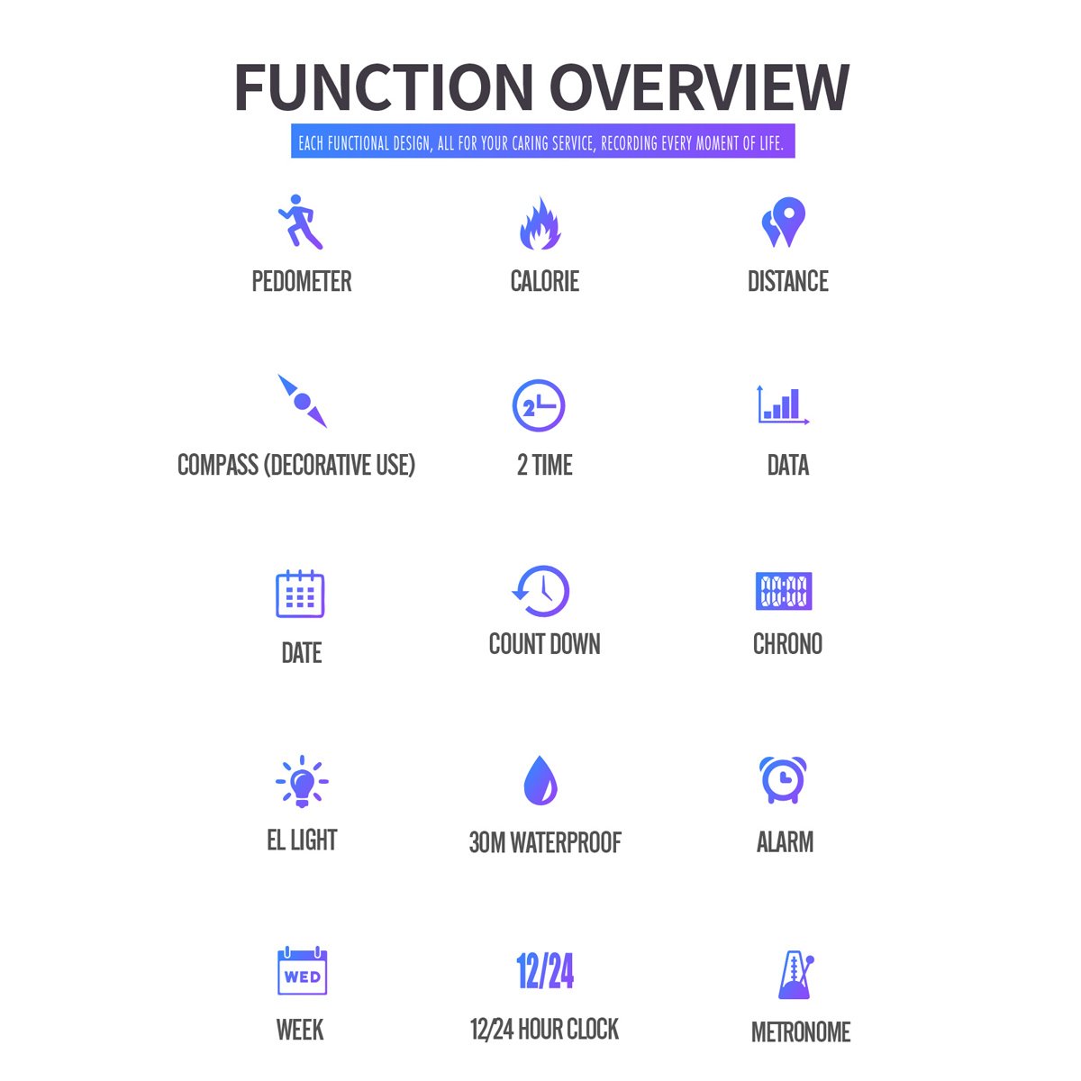 Includes built-in compass, 3D-pedometer, mileage tracking and calories estimation, great for running, hiking or gym use.