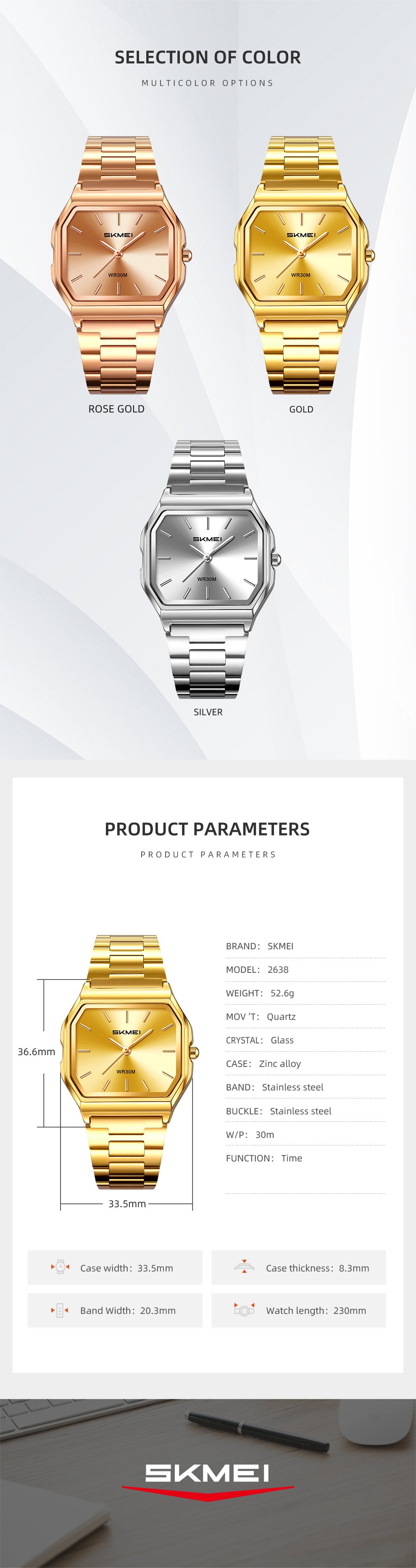 The zinc alloy case and stainless steel square watch bracelet offer a solid feel while keeping the weight around 52.6g for daily comfort.Movement & Accuracy