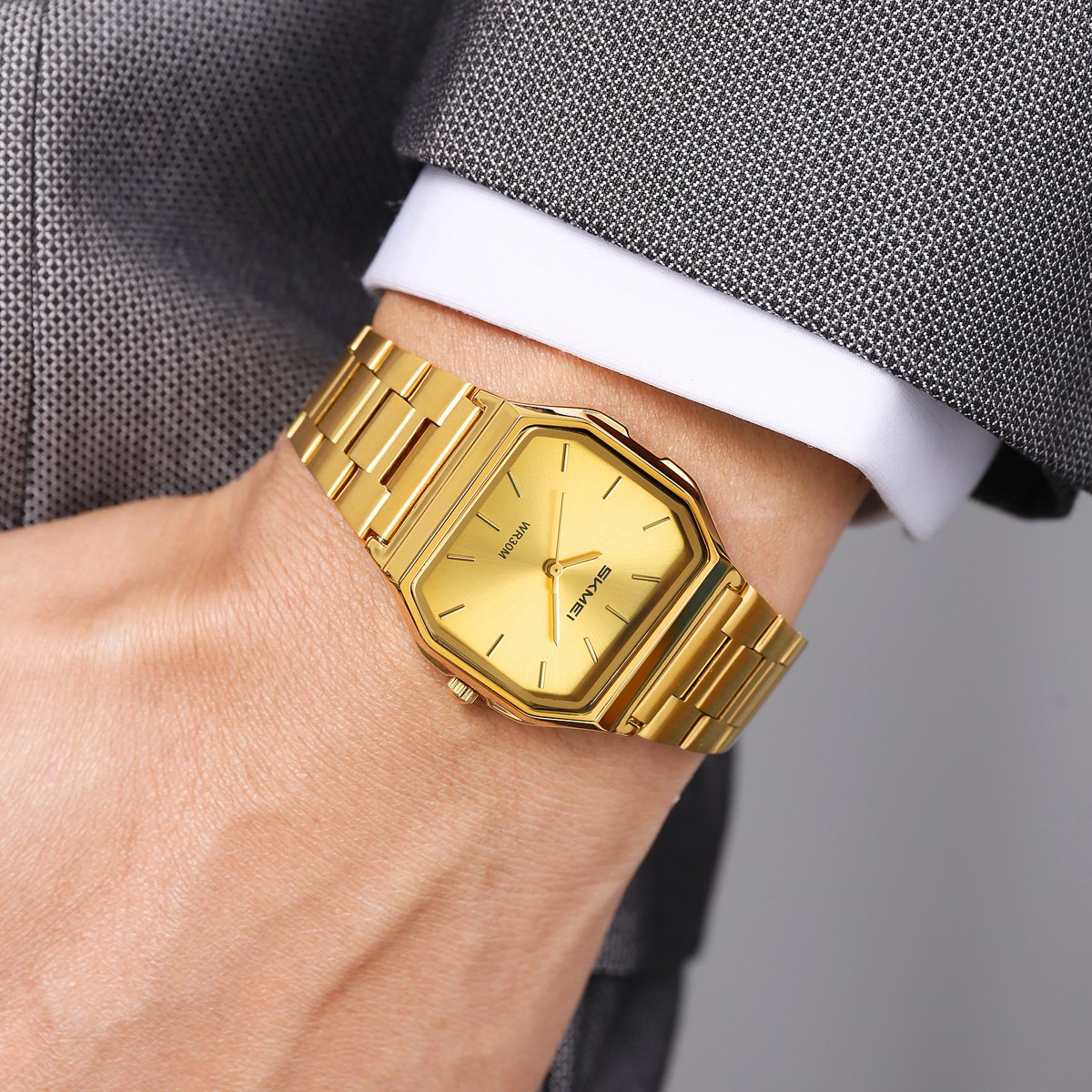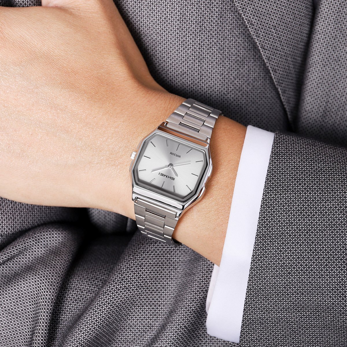 The curved case back and smooth bracelet links let this retro square analog watch sit comfortably on the wrist through long office days.Daily Versatility