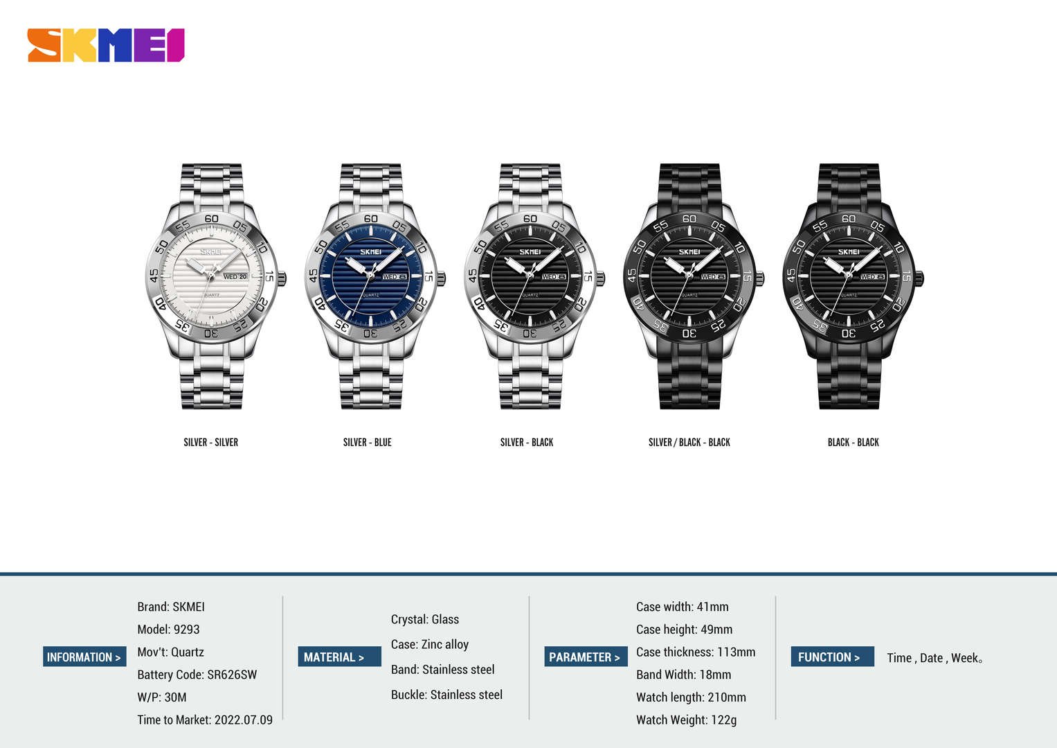 Built to last, the SKMEI 9293 men’s quartz watch boasts a zinc alloy case and a high-hardness glass dial window for scratch resistance. Weighing just 122g, this lightweight men’s watch ensures comfort during extended wear, whether at the office or on the go.
