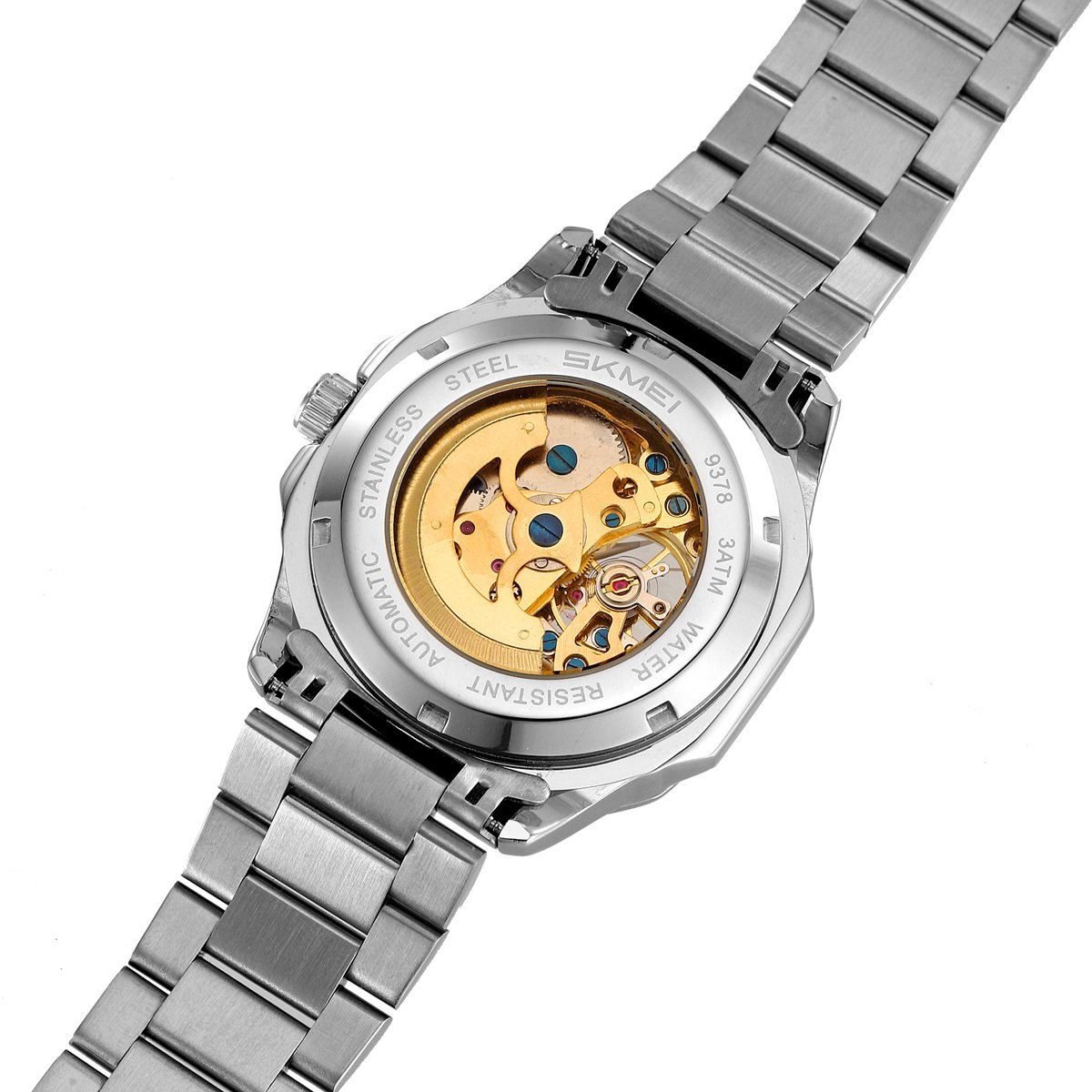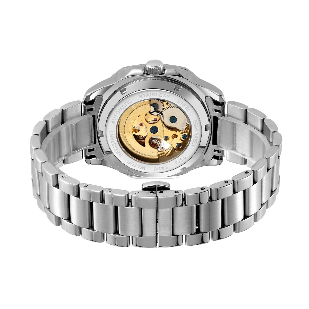 A solid stainless steel strap automatic mechanical watch design offers durable comfort on the wrist and matches both shirts and formal business suits.