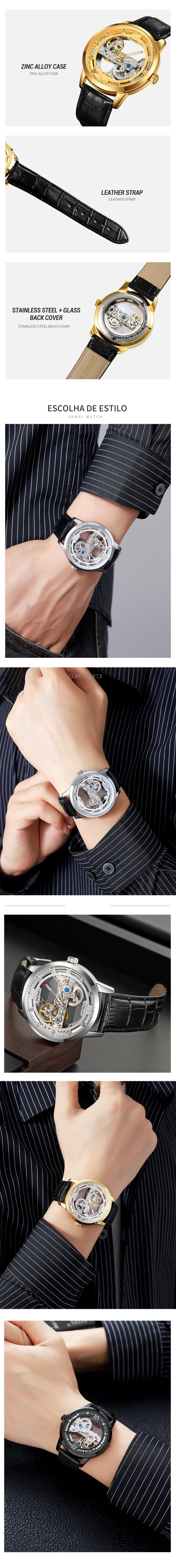 The SKMEI M031 delivers timeless style with its transparent skeleton dial that offers a glimpse into the gear-driven movement. The 22 mm genuine leather strap fits comfortably on the wrist, adding sophistication to both casual and formal looks. This combination makes it a versatile choice for collectors and newcomers to mechanical watch men styles.