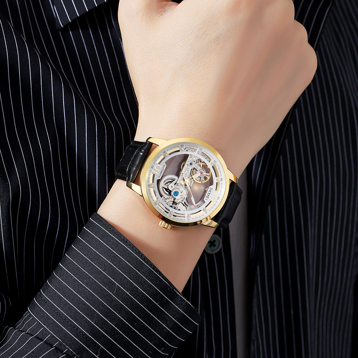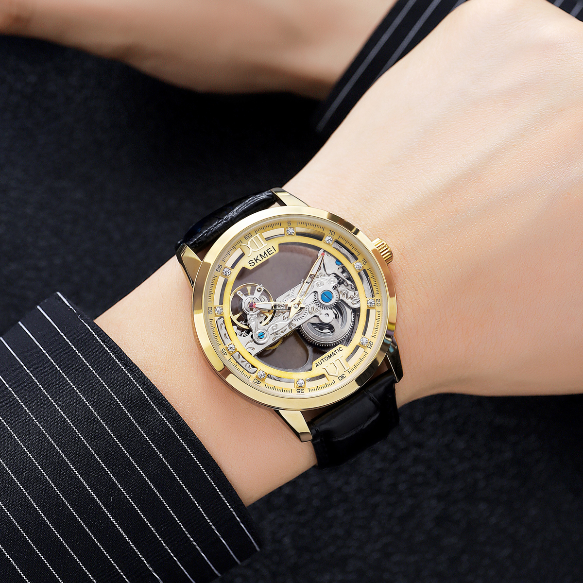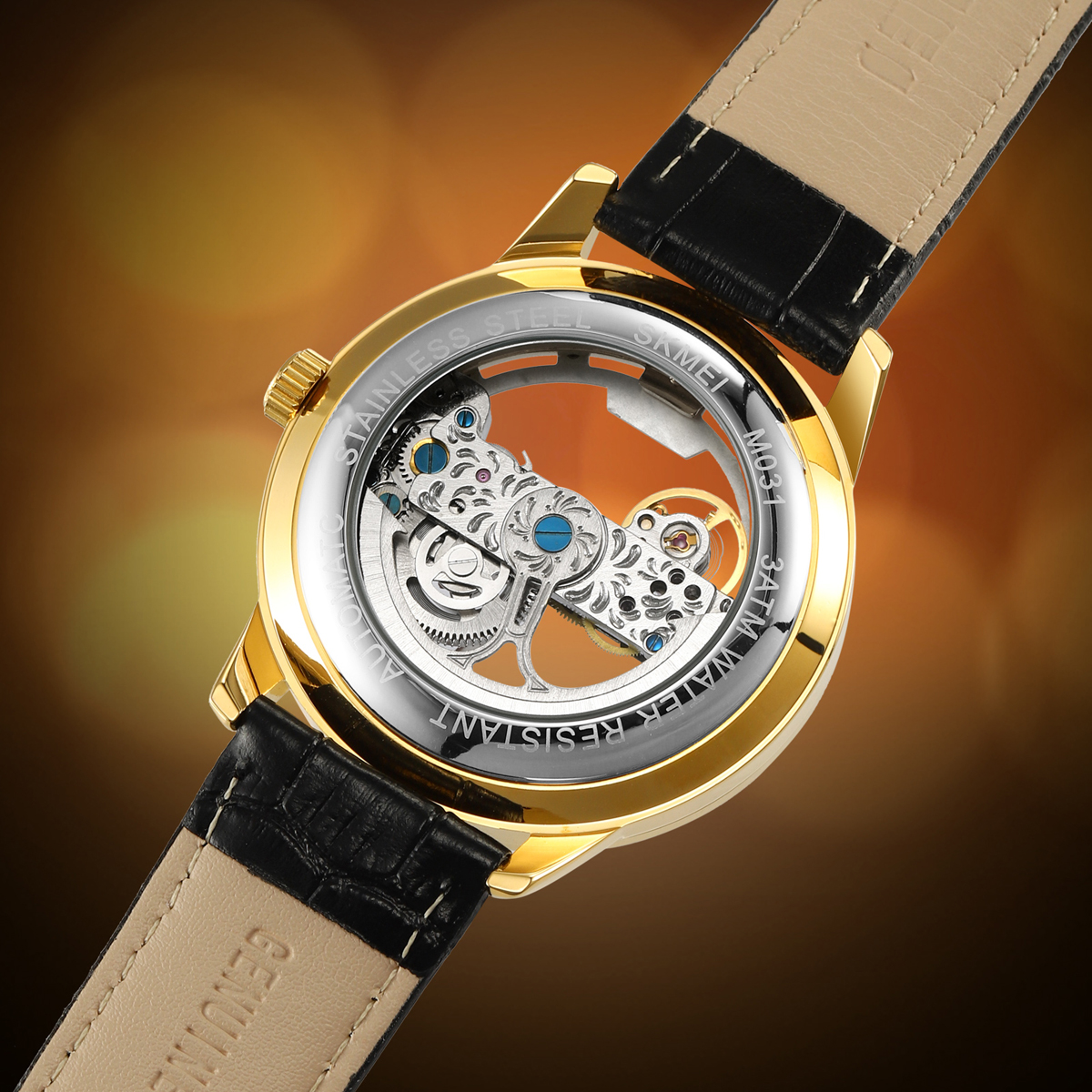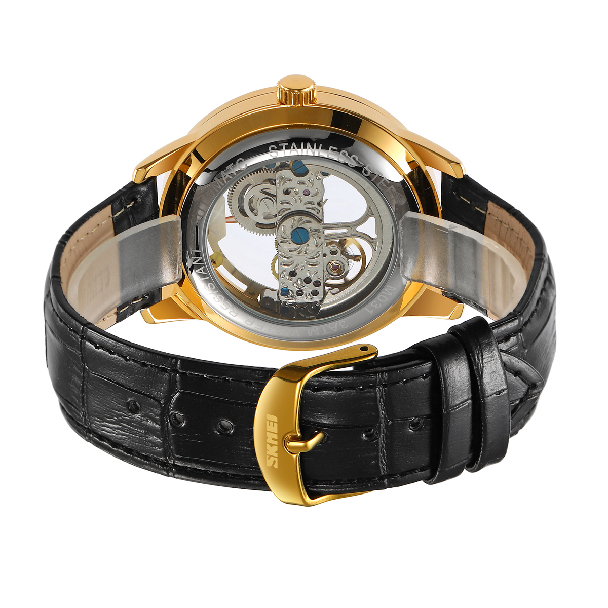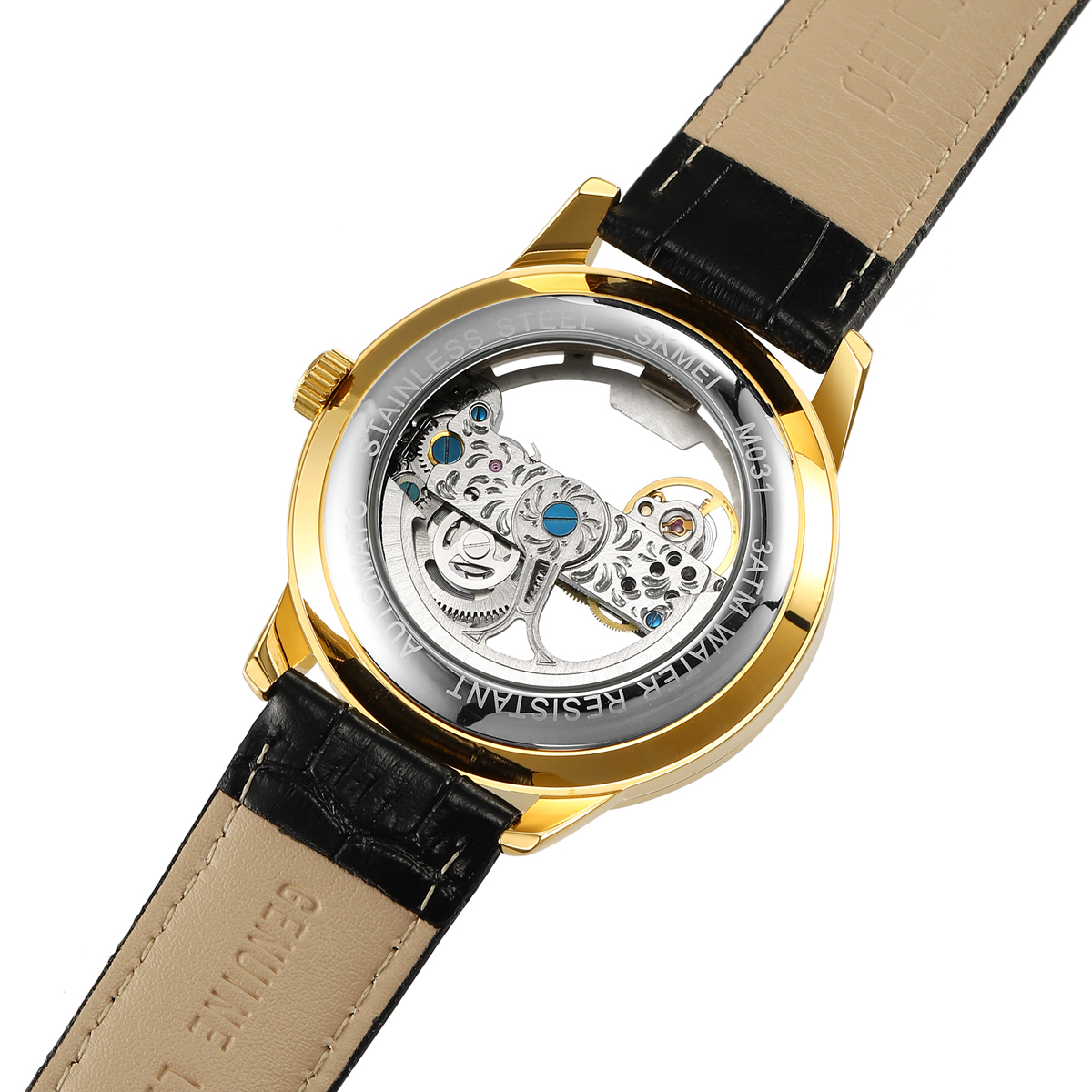 The SKMEI M031 delivers timeless style with its transparent skeleton dial that offers a glimpse into the gear-driven movement. The 22 mm genuine leather strap fits comfortably on the wrist, adding sophistication to both casual and formal looks. This combination makes it a versatile choice for collectors and newcomers to mechanical watch men styles.