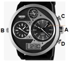 - The digital time dial is controlled by buttons C and D, including time, date and EL backlight.