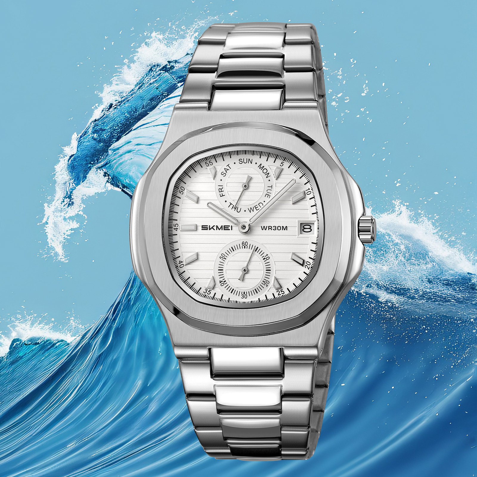 Choose the SKMEI 2423 square dial dress watch for a clean square profile, stainless steel build, and everyday chronograph practicality in one piece.