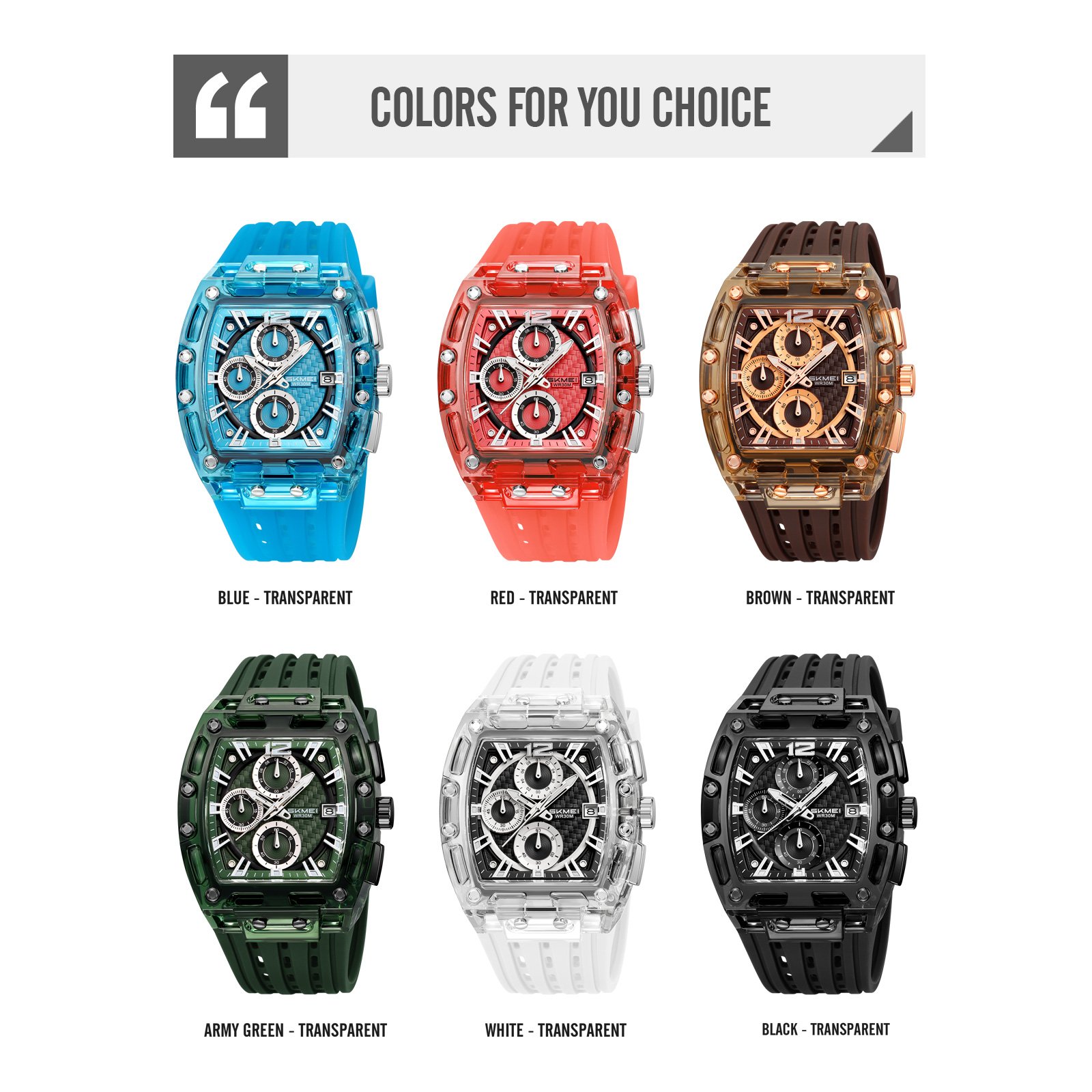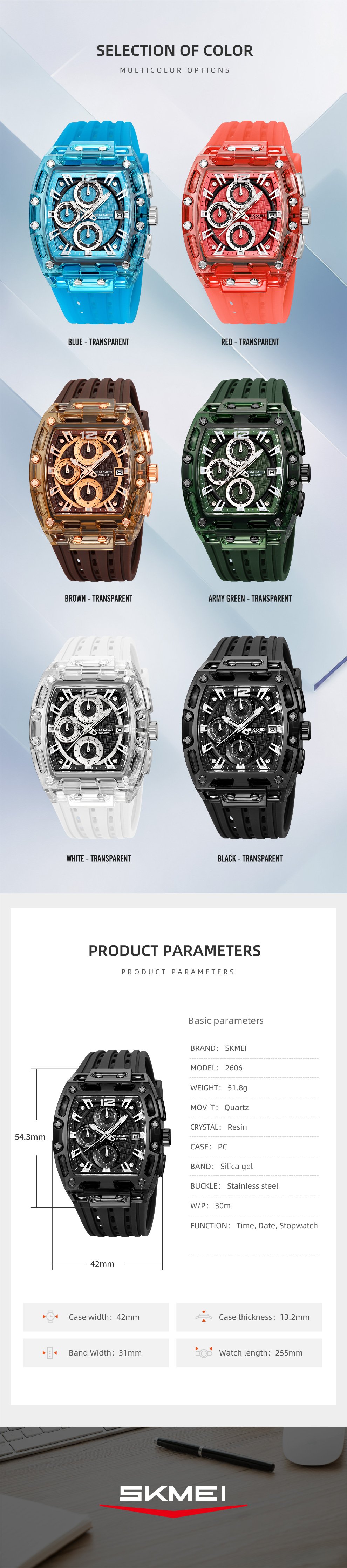 Silica gel bands and PC cases come in codes 2606BU, 2606RD, 2606BN, 2606AG, 2606WT, and 2606BK to match different outfits and wrist preferences.